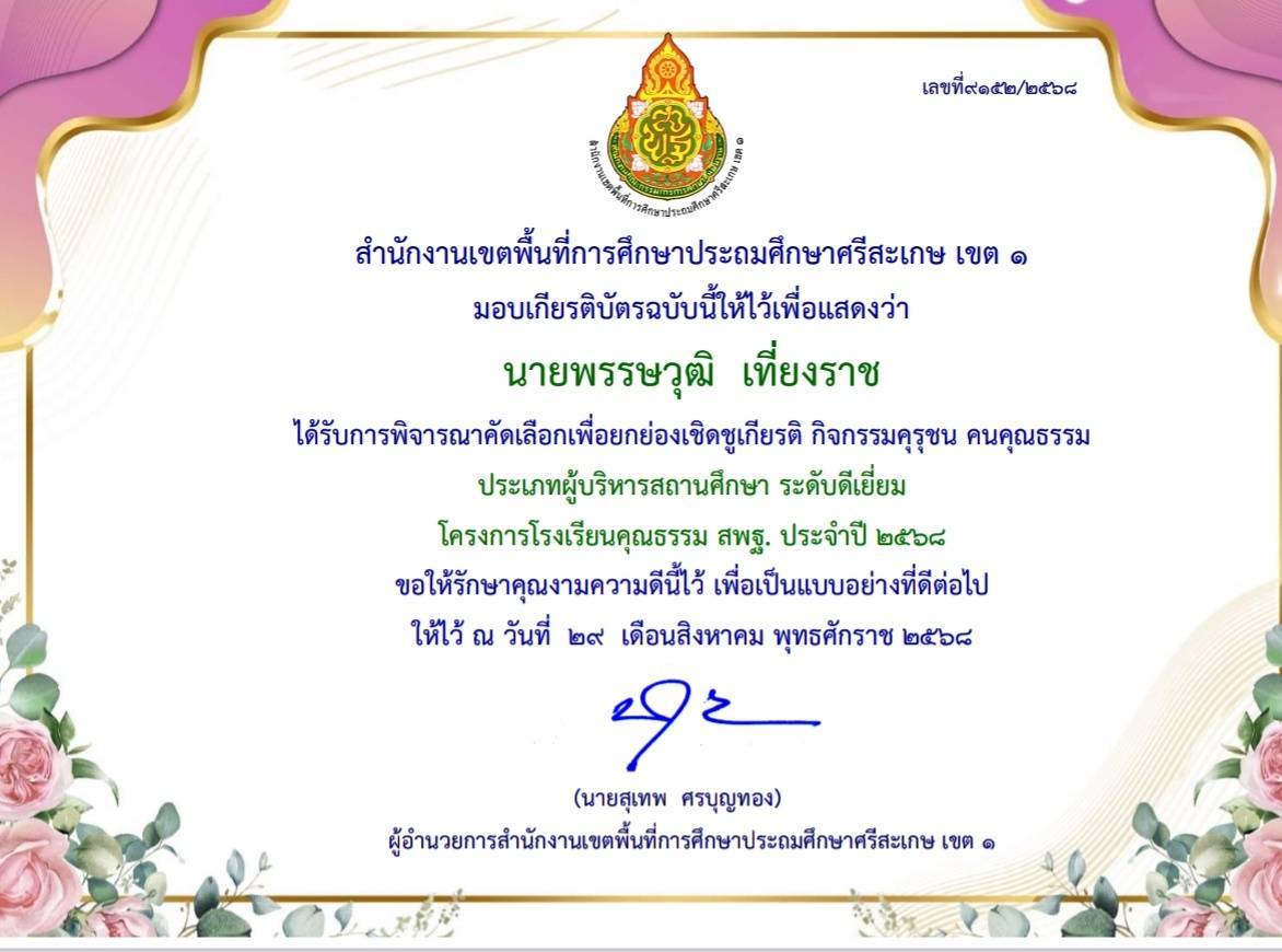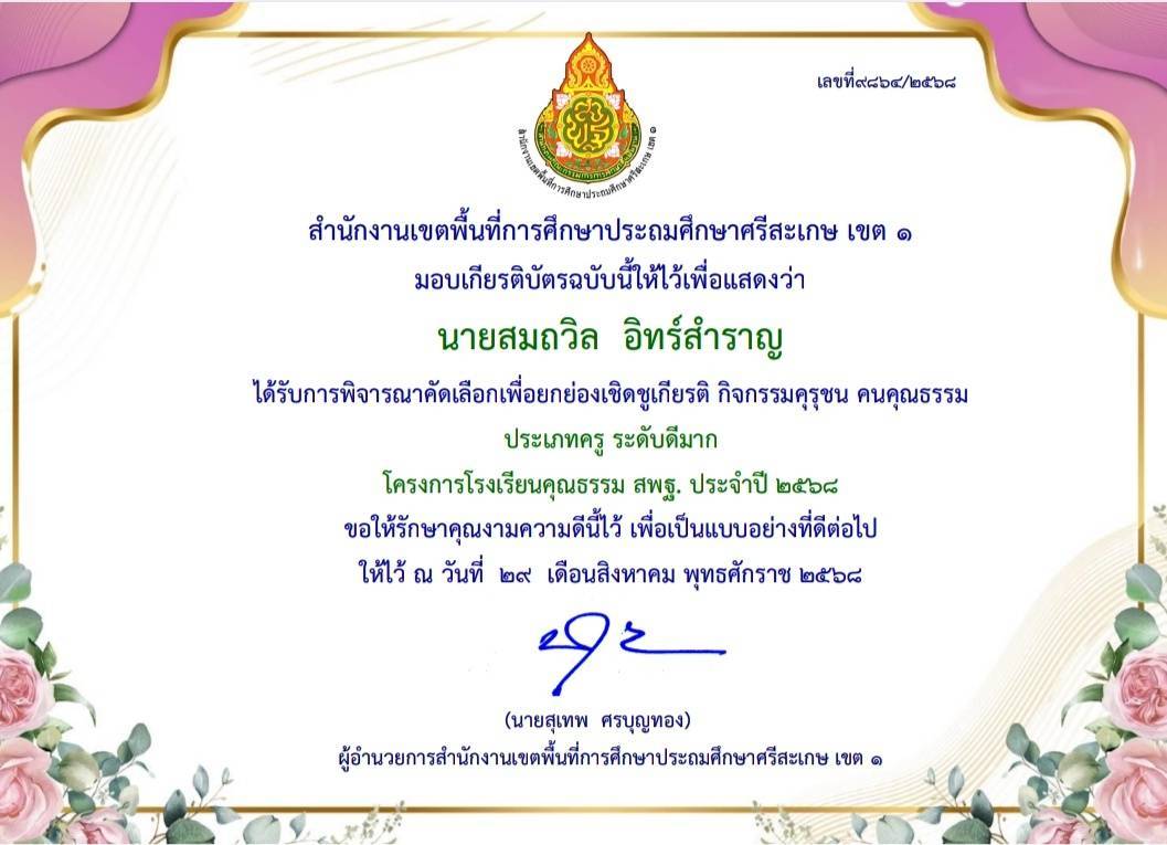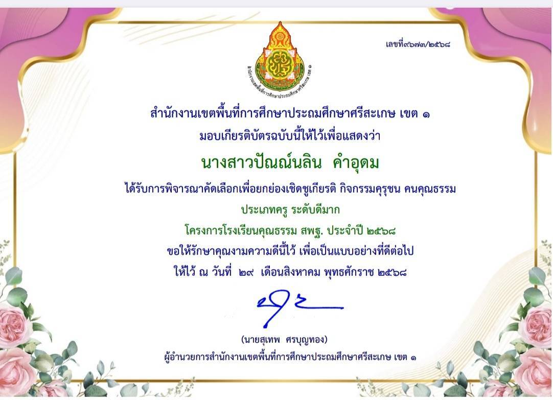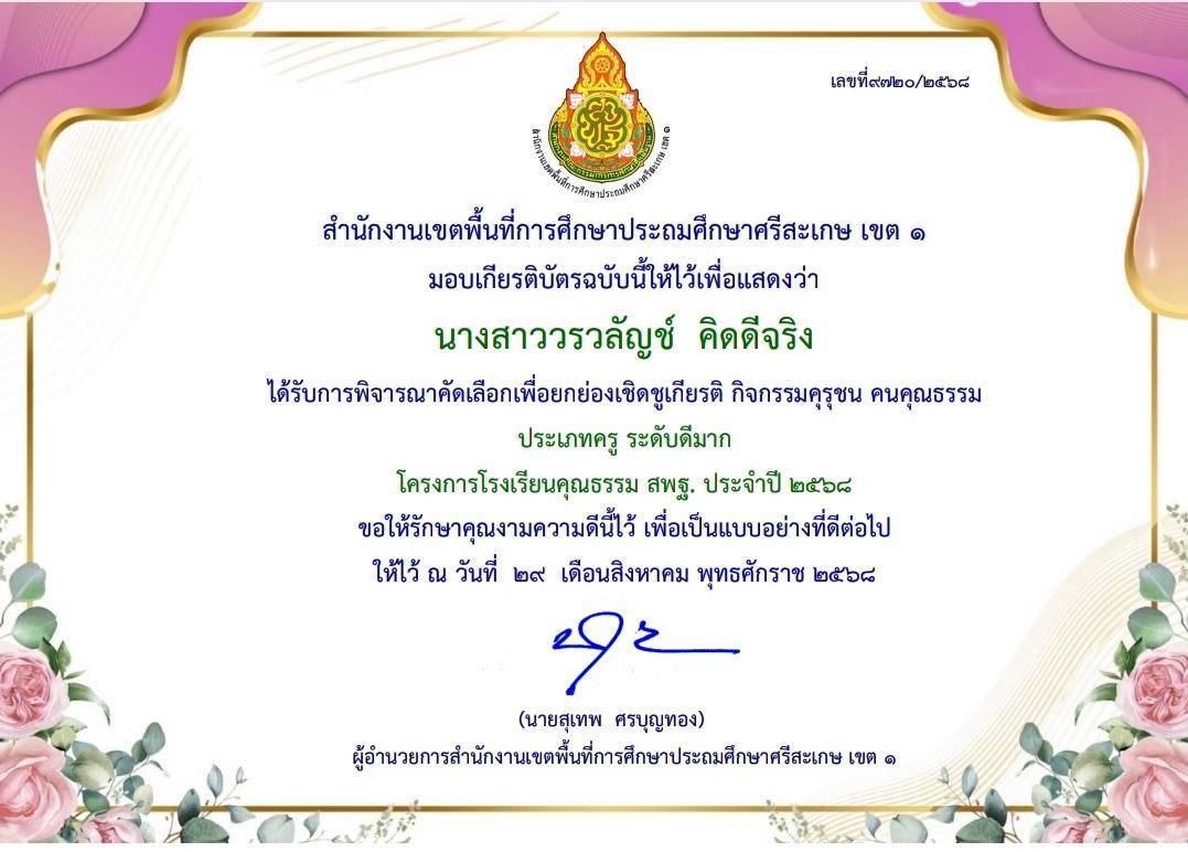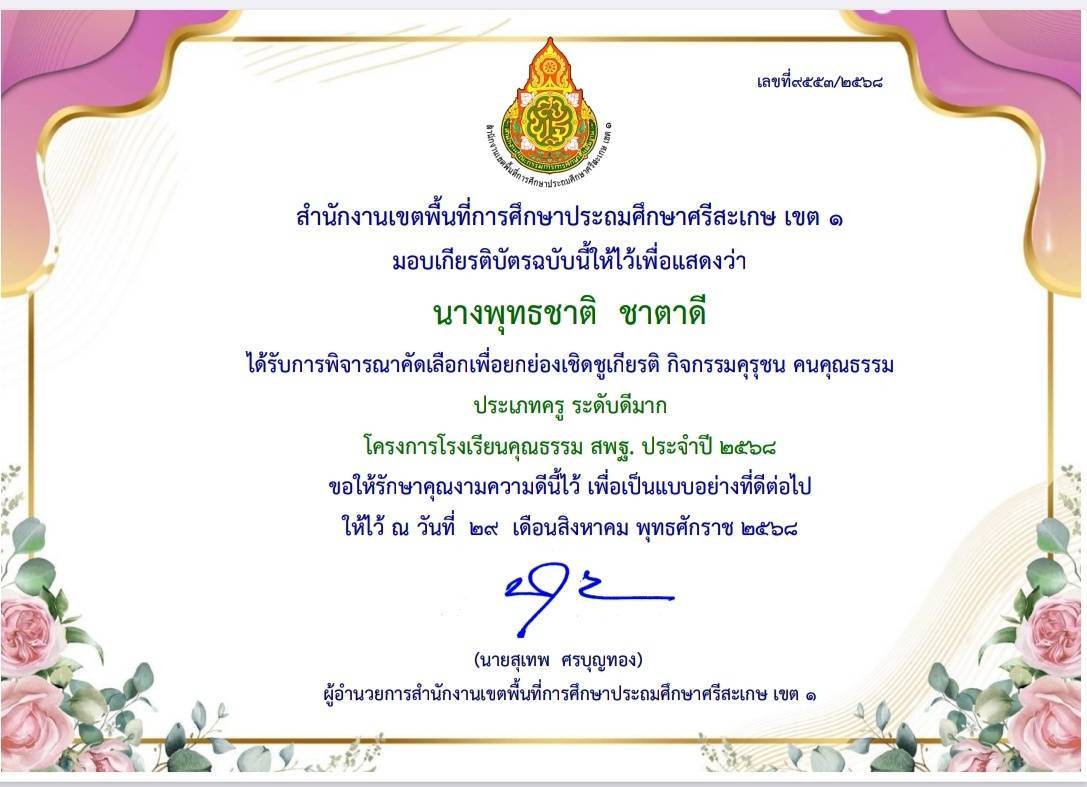 ได้รับการพิจารณาคัดเลือกเพื่อยกย่องเชิดชูเกียรติ กิจกรรมคุรุชน คนคุณธรรม ประเภทครู ระดับดีมาก