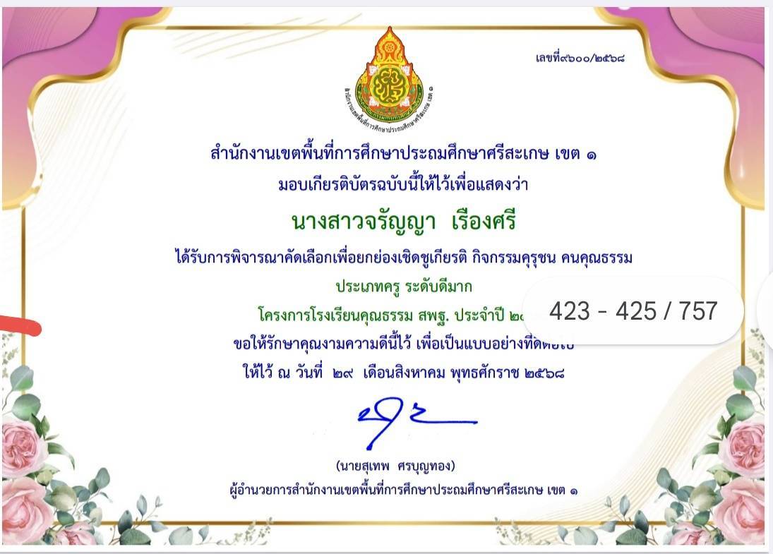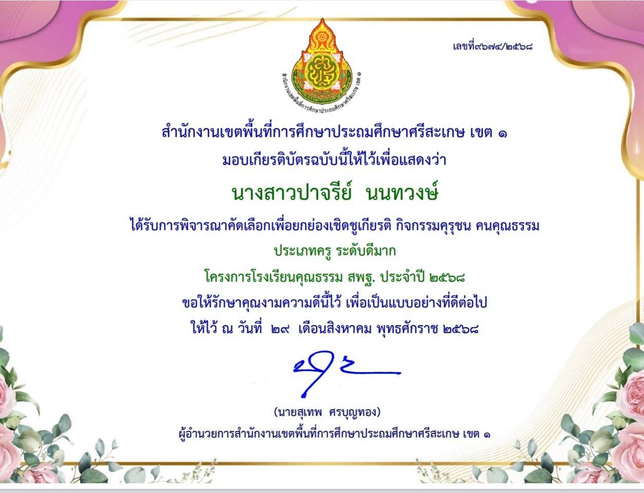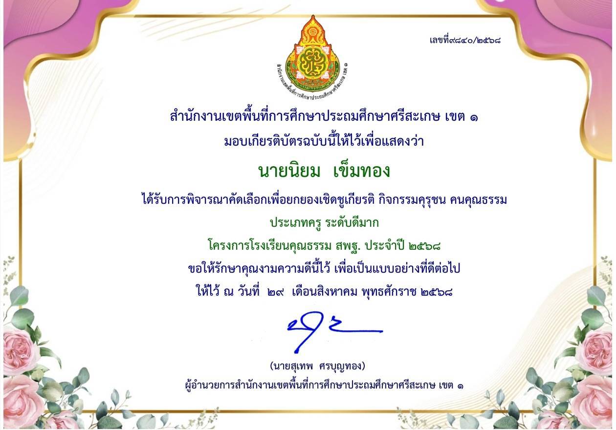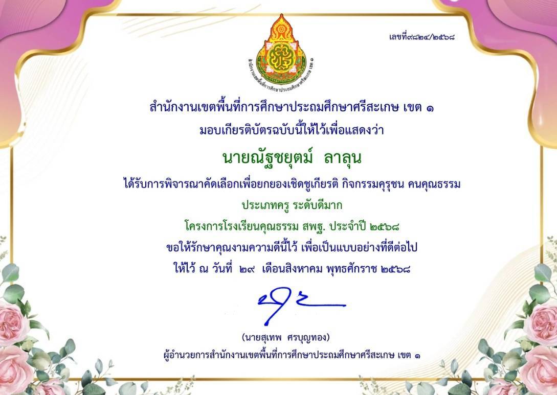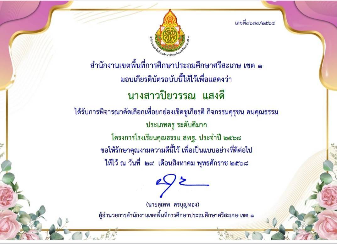 ได้รับการพิจารณาคัดเลือกเพื่อยกย่องเชิดชูเกียรติ กิจกรรมคุรุชน คนคุณธรรม ประเภทครู ระดับดีมาก