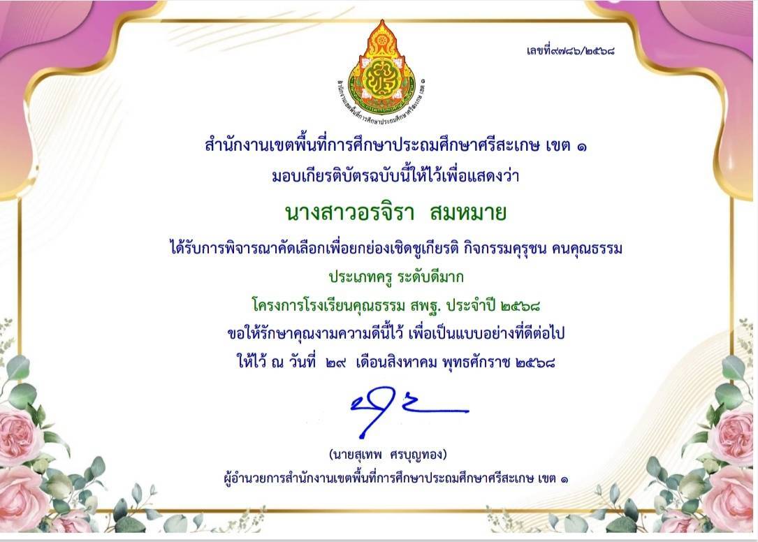 ได้รับการพิจารณาคัดเลือกเพื่อยกย่องเชิดชูเกียรติ กิจกรรมคุรุชน คนคุณธรรม ประเภทครู ระดับดีมากโครงการโรงเรียนคุณธรรม สพฐ. ประจำปีการศึกษา 2568 |