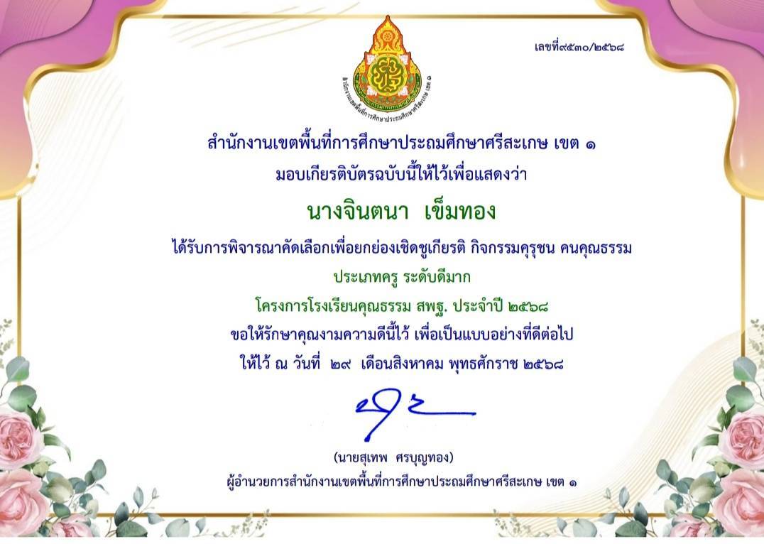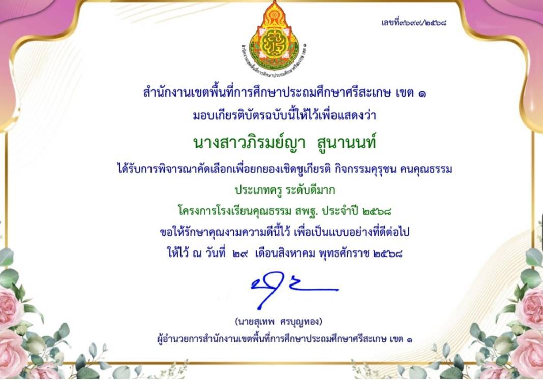 ผู้ฝึกสอนนักเรียนได้รับรางวัลเกียรติบัตรระดับเหรียญทอง ชนะเลิศ ระดับเขตพื้นที่การศึกษา การแข่งขันการเต้นประกอบเพลง Cover Dance Contest (ลูกเสือต้านภัยยาเสพติด) ชั้นมัธยมศึกษาปีที่ ๑-๓ |